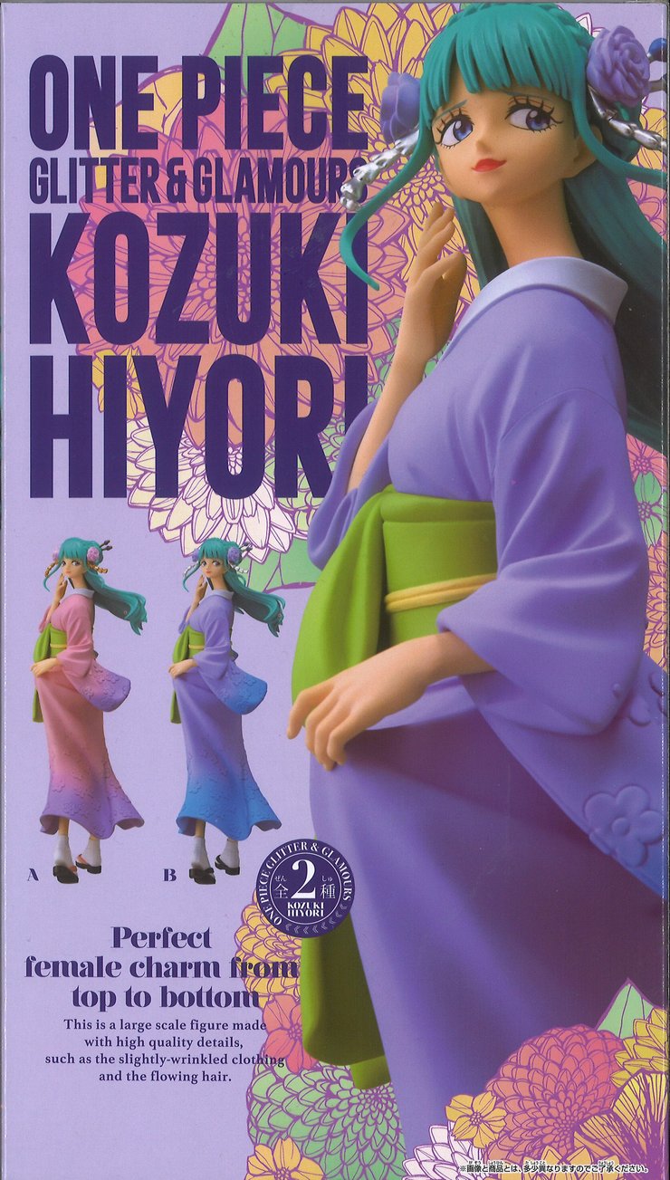 From the One Piece anime, Kozuki Hiyori comes to the Glitter & Glamours figure line by Banpresto. Kozuki Hiyori has silver accents in her hair and wears a purple flowing kimono with a green waistband.